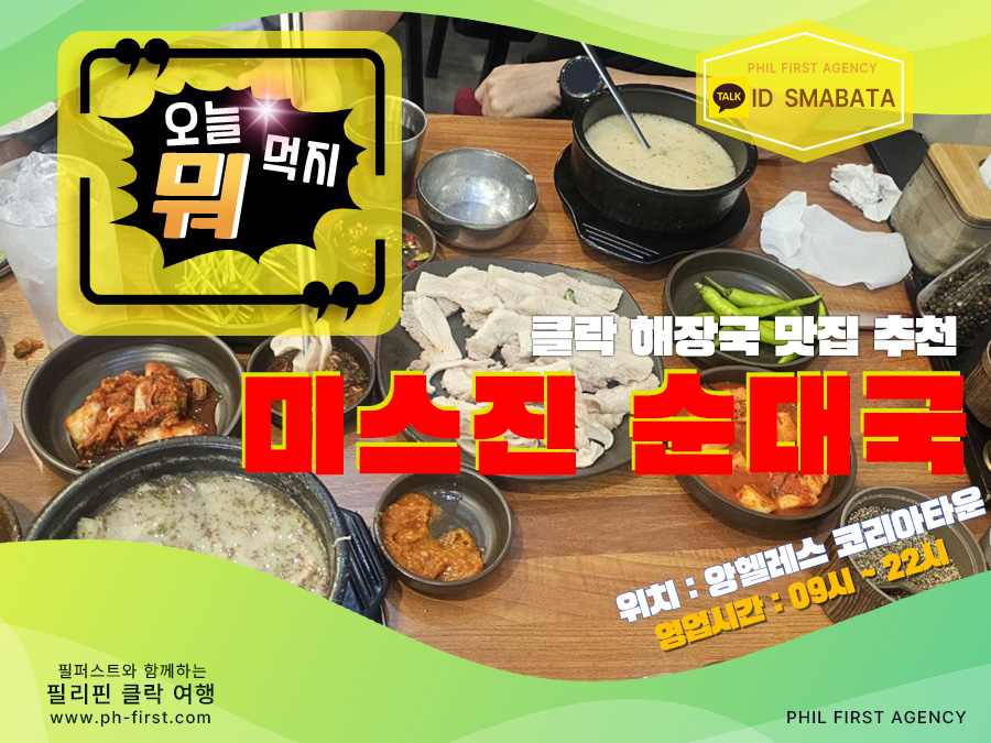 알만한 사람은 모두 아는 클락 대표 순대국 맛집 '미스진'클락 여행 온다면 꼭 가볼만한 맛집 추천!!안녕하세요 클락 카지노 매니저 "필퍼스트 에이전시" 입니다!!필리핀 클락, 앙헬레스 여행을 와보셨다면 무조건 가보셨을 만한 맛집~클락으로 카지노, 골프 여행 오시면 저녁에 소주 한잔은 빠질 수가 없죠?과음은 해롭지만 다음 날 뜨끈한 국물로 해장은 필수잖아요^^클락, 앙헬레스 대표 국밥 맛집 '미스진 순대국'을 소개 해드리겠습니다!!클락 카지노 맛집 추천미스진 순대국대표 메뉴 - 순대국, 돼지 국밥 등위치 - 앙헬레스 코리아타운영업 시간 - AM 09:00 ~ PM 10:00재방문 의사 - ★★★★★클락 맛집 '미스진 순대국'은 클락 여행을 와보셨다면 무조건 가보셨을 만한 맛집 입니다!!클락, 앙헬레스에 많은 국밥 맛집이 있어요~그 중에서도 '미스진 순대국'이 제일 맛있다고 손꼽는 분들이 굉장히 많습니다^^그래서 점심시간에 방문을 하면 가끔 웨이팅이 발생하는 식당이기도 해요!!순대국 맛은 해장을 하러 갔다가 해장술이 생각날 정도로 맛이 좋은데개인적으로 한국의 웬만한 순대국 맛집과 비교해도 좋을 만큼 훌륭합니다!!순대국에 순대, 고기, 내장도 엄청나게 많이 들어가 있어서 만족도 최상^^얼큰한 국물이 땡기시는 분들은 불꽃 (매운 맛)으로 주문을 하시고거기에 다진 고추 넣어 드시면 땀이 뻘뻘 날 정도로 얼큰하게 드실 수 있습니다!!'미스진 순대국' 순대 그리고 수육도 맛이 좋은 편이라저녁 시간대에 방문해 국밥 한 그릇에 순대나 수육 시켜서 소주 한잔 하시기도 좋아요^^이미 너무 유명해진 클락, 앙헬레스 대표 국밥 맛집이다 보니 모르시는 분들이 없겠지만그래도 클락으로 카지노, 골프 여행이 처음이신 분들을 위해서'미스진 순대국'을 소개 해드렸으니 클락으로 여행을 오시면 꼭 한번 방문해보셔도 좋습니다!!클락 카지노에서도 멀지 않은 코리아타운 초입에 위치해있는 맛집 이기에잠시 바람 쐬러 외출하셔서 식사하시기에도 좋은 식당 입니다^^클락 카지노에서 거리한(HANN) 카지노 : 약 10분로이스 카지노 : 약 5분힐튼 디하이츠 카지노 : 약 10분필리핀 클락 맛집 추천 '미스진 순대국' 꼭 기억 해두셨다가클락 여행 오시면 잊지 말고 방문 하셔서 맛있는 식사 해결하시길 바라겠습니다!!▶ 필리핀 클락 카지노 & 여행 문의클락 카지노 정킷 VIP 서비스 문의카톡 ID - SMABATA#클락_카지노 #필리핀_카지노 #필리핀_클락_카지노 #마닐라_카지노 #앙헬레스_카지노 #클락_카지노_에이전시 #클락_카지노_에이전트 #클락_한_카지노 #클락_위더스_카지노 #클락_힐튼_디하이츠_카지노 #클락_로이스_카지노 #클락_미도리_카지노 #클락_힐튼_카지노 #클락_카지노_프리룸 #클락_카지노_호텔_프리룸 #클락_리조트_카지노 #클락_카지노_정킷 #클락_카지노_정킷_서비스 #클락_카지노_정킷_이용혜택 #클락_카지노_문의 #클락_카지노_환전 #클락_카지노_환전소 #클락_카지노_송금_환전 #클락_카지노_계좌이체_환전 #클락_카지노_원화_페소_환전 #클락_카지노_계좌이체_환전 #클락_카지노_페소_환전 #클락_카지노_페소_환전_방법 #클락_카지노_환전_방법 #클락_카지노_정킷_에이전시 #클락_카지노_무료_숙박 #클락_카지노_멤버쉽_포인트 #클락_카지노_추천 #클락_위더스_카지노