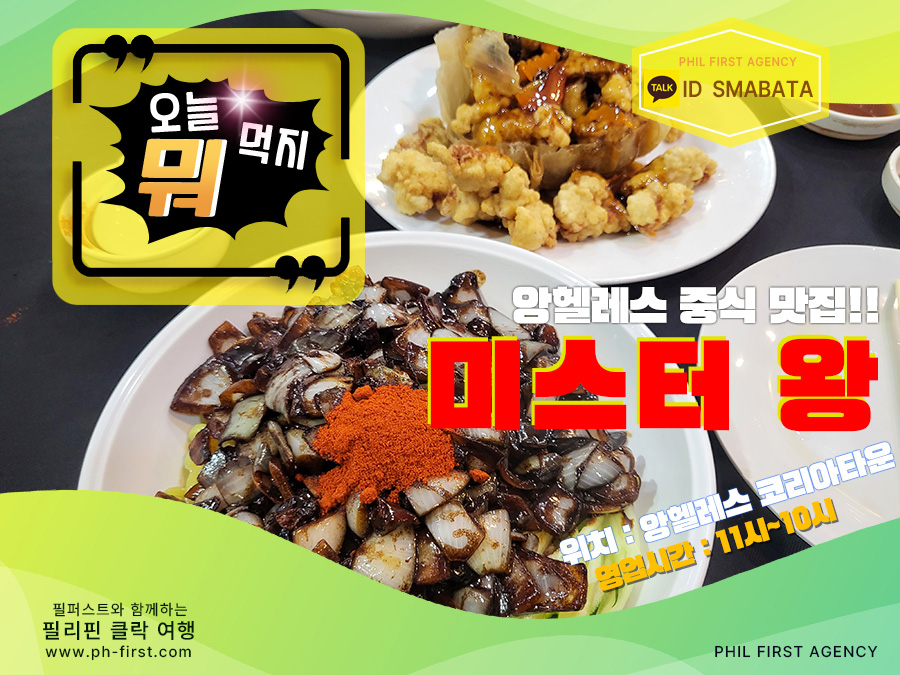 필리핀 클락 대표 중식 맛집 "미스터 왕"간짜장, 탕수육 맛집!!안녕하세요 클락 카지노 매니저 "필퍼스트 에이전시" 입니다!!필리핀 클락, 앙헬레스에는 수많은 중국집이 있어요~만복림, 차이라이, 용천각 등 말 그대로 중식 전쟁 입니다^^수 많은 중국집 중 누군가가 저에게 제일 괜찮은 곳을 추천 해달라고 한다면저는 단번에 "미스터 왕 (Mr. Wang)"을 추천 해드릴 거에요!!알 만한 사람은 다 아는 클락 대표 중식 맛집 "미스터 왕" 입니다~클락 카지노 맛집 추천미스터 왕 (Mr. Wang)대표 메뉴 - 간짜장, 탕수육, 훠궈위치 - 앙헬레스 코리아타운영업 시간 - AM 11:00 ~ PM 10:00재방문 의사 - ★★★★★사실 필리핀 클락으로 한번쯤 여행을 와보셨다면 미스터왕은 모르기 힘드실거에요~제가 첫 필리핀 클락 여행이 2014년 이었는데 그때부터 지금까지 쭉 영업을 하고 있을 정도로유명하고 한국인 관광객들에게 잘 알려진 앙헬레스 중국집 중 한 곳 입니다!!제가 꼽는 미스터 왕의 대표 메뉴는 간짜장과 탕수육 입니다^^미스터 왕을 찾게 되면 저는 메뉴판을 보지도 않고 항상 두가지 음식을 주문해요!!개인적으로 웬만한 한국 중국집 보다 간짜장, 탕수육은 훨씬 낫다고 생각을 합니다~특히 탕수육은 필리핀 클락에서는 최고라고 생각이 들 정도 입니다!!새콤한 탕수육을 좋아하시는 분들이라면 호불호 없이 모두 맛있게 드실거에요~필리핀 클락으로 여행 오셔서 미스터 왕 가신다면 탕수육은 필수로 주문 하셔야 합니다^^미스터 왕 짬뽕은 그렇게 맛있다고 하기는 조금 애매하기는 합니다!!짜장의 맛이 너무 좋아서 그런지 짬뽕은 기대에 미치지는 못 하더라구요~미스터 왕 훠궈도 정통 중국식으로 맛이 좋기로 유명하다고 하는데아직 제가 먹어보질 못 해서 적극 추천 드리지는 못 하겠네요^^그래도 대부분의 음식이 평균 이상은 하기 때문에 훠궈도 충분히 괜찮을 것 같긴 합니다!!이미 너무 유명한 필리핀 클락, 앙헬레스 대표 중식 맛집 이지만미스터 왕을 빼놓고 클락 맛집을 소개 해드리는건 실례이진 않을까요?필리핀 클락으로 카지노, 골프 여행을 오신다면 잊지말고 찾아가야 할 맛집 중 한 곳 입니다^^클락 카지노에서의 거리한(HANN) 카지노 : 약 10분힐튼 디하이츠 카지노 : 약 10분로이스 카지노 : 약 5분필리핀 클락 맛집 추천 "미스터 왕 (Mr. Wang)" 꼭 기억 해두시고클락 여행 오셔서 '오늘 뭐 먹지' 고민이 되신다면 잊지 말고 방문 해보세요!!▶ 필리핀 클락 카지노 & 골프 여행 문의클락 카지노 정킷 VIP 서비스카톡 ID - SMABATA#클락_카지노 #필리핀_카지노 #필리핀_클락_카지노 #마닐라_카지노 #앙헬레스_카지노 #클락_카지노_에이전시 #클락_카지노_에이전트 #클락_한_카지노 #클락_위더스_카지노 #클락_힐튼_디하이츠_카지노 #클락_로이스_카지노 #클락_미도리_카지노 #클락_힐튼_카지노 #클락_카지노_프리룸 #클락_카지노_호텔_프리룸 #클락_리조트_카지노 #클락_카지노_정킷 #클락_카지노_정킷_서비스 #클락_카지노_정킷_이용혜택 #클락_카지노_문의 #클락_카지노_환전 #클락_카지노_환전소 #클락_카지노_송금_환전 #클락_카지노_계좌이체_환전 #클락_카지노_원화_페소_환전 #클락_카지노_계좌이체_환전 #클락_카지노_페소_환전 #클락_카지노_페소_환전_방법 #클락_카지노_환전_방법 #클락_카지노_정킷_에이전시 #클락_카지노_무료_숙박 #클락_카지노_멤버쉽_포인트 #클락_카지노_추천 #클락_위더스_카지노