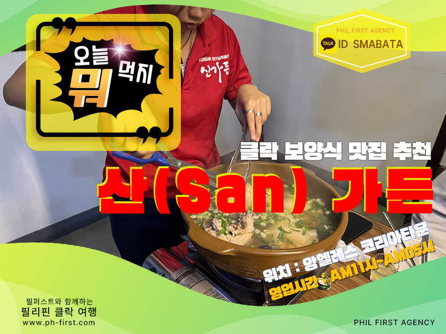 클락 여행 중 쌓인 피로를 풀기 좋은 백숙 맛집!!클락 카지노 게임 이후 원기 회복하기 좋은 맛집 산 가든 (San garden)안녕하세요 클락 카지노 매니저 "필퍼스트 에이전시" 입니다!!무덥고 습한 날씨가 지속되는 필리핀 클락의 우기 시즌 입니다~외부 날씨는 너무 무덥고 반대로 카지노 안은 너무 춥고 감기 걸리기 딱 좋은 날씨에요^^이럴수록 지친 몸을 달래줄 수 있는 몸 보신 생각이 나는건 당연한거겠죠?오랜만에 손님들 몸 보신도 시켜드릴 겸 한방 백숙 먹으러 다녀왔습니다!!클락 여행 중 카지노, 골프 여행으로 쌓인 피로를 해소하기 위해 몸 보신을 원하시는 분들이 계시다면오늘 소개 해드리는 '산 가든 (San Garden)' 방문 하셔서 맛있는 백숙 드셔보시길 바랍니다~클락 카지노 맛집 추천산 가든 (San Garden)대표 메뉴 - 백숙 (한방, 능이, 옻), 반계탕, 생선구이 등위치 - 앙헬레스 코리아타운영업 시간 - AM 11:00 ~ AM 05:00재방문 의사 - ★★★★☆클락 맛집 '산 가든'은 백숙 등 보양식을 비롯해 다양한 한식을 맛볼 수 있는 맛집 이에요!!오전 11시 부터 익일 새벽 늦은 시간까지 영업을 하다 보니 언제든 방문하기 좋은 식당 이구요~특히나 늦은 시간까지 카지노 게임 후 든든한 식사 한끼를 원하시는 분들께는더할 나위 없이 좋은 선택이 될 수 있는 식당이 바로 '산 가든'이 아닐까 싶습니다^^모든 테이블이 룸이기 때문에 일행들끼리 조용하게 식사가 가능한것이 장점 이구요~음식 맛은 꽤나 수준급으로 호불호 없이 만족할만한 맛이라고 생각을 해요!!저도 오랜만에 손님들 모시고 가서 한방 백숙으로 몸 보신 제대로 하고 왔습니다^^한방 백숙 모든 재료가 한국에서 온 제품으로 조리하기 때문에 국물이 너무 좋았어요~한국에서는 옻을 잘 안타서 옻 백숙을 즐겨 먹었지만 혹시나 하는 마음에 초이스를 못 했는데옻 역시 한국에서 진액을 가져와서 조리 한다고 하니 다음에 꼭 도전 해봐야겠습니다!!진한 국물에 죽 까지 조리해서 먹으면 완벽한 한끼 식사 완성이죠^^백숙 종류는 40분 정도 전에 미리 예약하면 기다리지 않아도 된다고 하니 예약은 필수에요~클락 맛집 '산 가든'의 또 다른 인기 메뉴인 생선구이도 퀄리티 굉장히 좋은 편이구요~백숙 양이 많아 부담스러운 분들이 계시다면 반계탕도 맛이 좋으니 꼭 드셔보시길 바래요!!클락 카지노 → 산 가든 까지의 거리클락 한(HANN) 카지노 약 10분클락 로이스 카지노 약 5분클락 힐튼 디하이츠 카지노 약 10분클락 카지노에서 가까운 앙헬레스 코리아타운에 위치한 클락 맛집 '산 가든'클락 여행 중 꼭 한번 방문하셔서 맛 있는 한끼로 여행에 쌓인 피로를 풀어보시길 바랍니다^^▶ 필리핀 클락 카지노 & 여행 문의클락 카지노 정킷 이용 문의카톡 ID - SMABATA#클락_카지노 #필리핀_카지노 #필리핀_클락_카지노 #마닐라_카지노 #앙헬레스_카지노 #클락_카지노_에이전시 #클락_카지노_에이전트 #클락_한_카지노 #클락_위더스_카지노 #클락_힐튼_디하이츠_카지노 #클락_로이스_카지노 #클락_미도리_카지노 #클락_힐튼_카지노 #클락_카지노_프리룸 #클락_카지노_호텔_프리룸 #클락_리조트_카지노 #클락_카지노_정킷 #클락_카지노_정킷_서비스 #클락_카지노_정킷_이용혜택 #클락_카지노_문의 #클락_카지노_환전 #클락_카지노_환전소 #클락_카지노_송금_환전 #클락_카지노_계좌이체_환전 #클락_카지노_원화_페소_환전 #클락_카지노_계좌이체_환전 #클락_카지노_페소_환전 #클락_카지노_페소_환전_방법 #클락_카지노_환전_방법 #클락_카지노_정킷_에이전시 #클락_카지노_무료_숙박 #클락_카지노_멤버쉽_포인트 #클락_카지노_추천 #클락_위더스_카지노